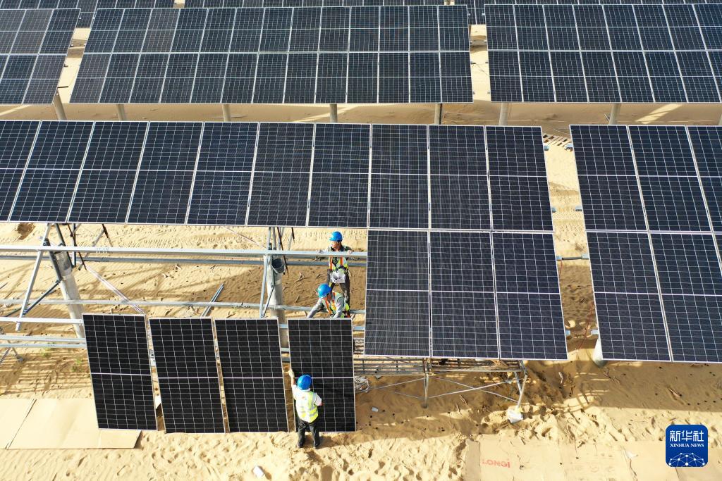 工人在库布其沙漠里的杭锦旗朔方新能源大基地安装光伏板(9月2日摄,无人机照片)。
