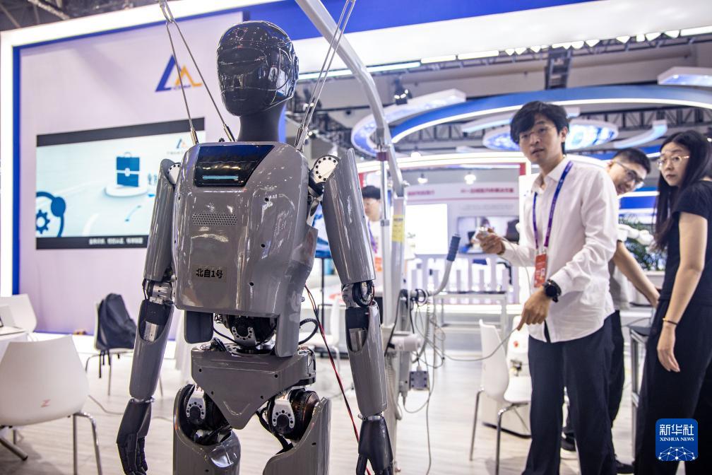 9月4日,工作人员在2025世界智能产业博览会会场调试机器人。