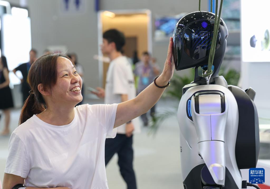 9月5日,在2025世界智能产业博览会现场,参展商和人形机器人互动。