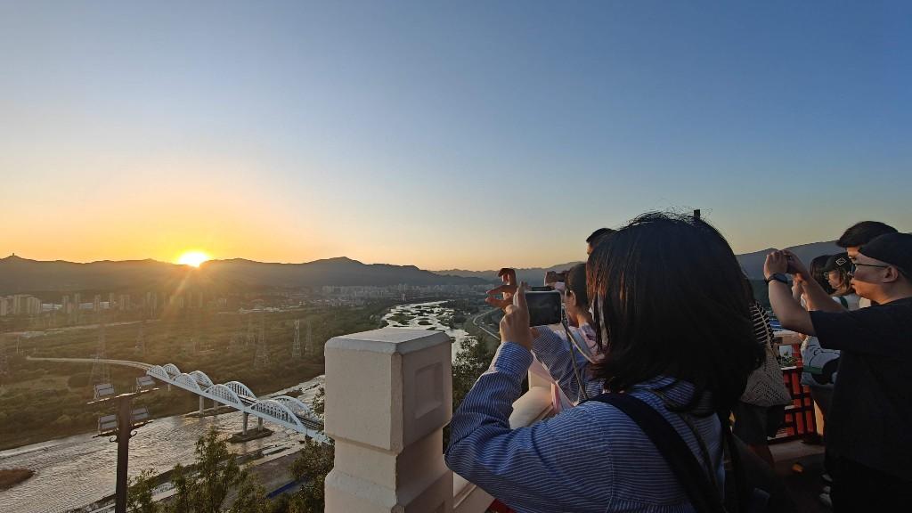 在永定河集北出口,新修的向河步道蜿蜒向上,直通石景山(本山)的观景平台。“我们新建了80米向河步道、提升改造了600米既有步道,改造提升后的石景山形成了南山小院、古建群、功碑阁三大文化景观区域。”石景山古建群文物保管所所长李伟介绍,游客逛完“永定河集”,直接从登山步道可至古建群区域,再从古建群登上功碑阁三层最高点,得以登高望远,观首钢全貌、赏落日余晖。