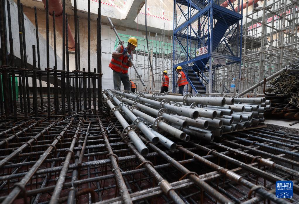 9月7日,工人在石家庄地铁5号线一期工程解放大街站建设工地施工。