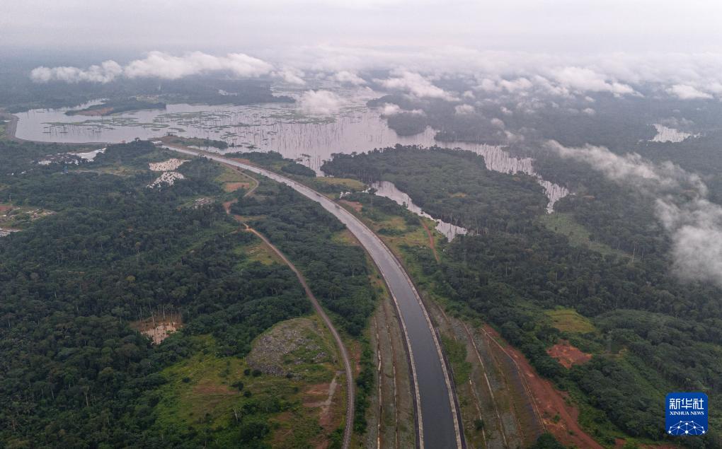 这是在喀麦隆南部大区拍摄的曼维莱水电站水渠(无人机照片,6月30日摄)。
