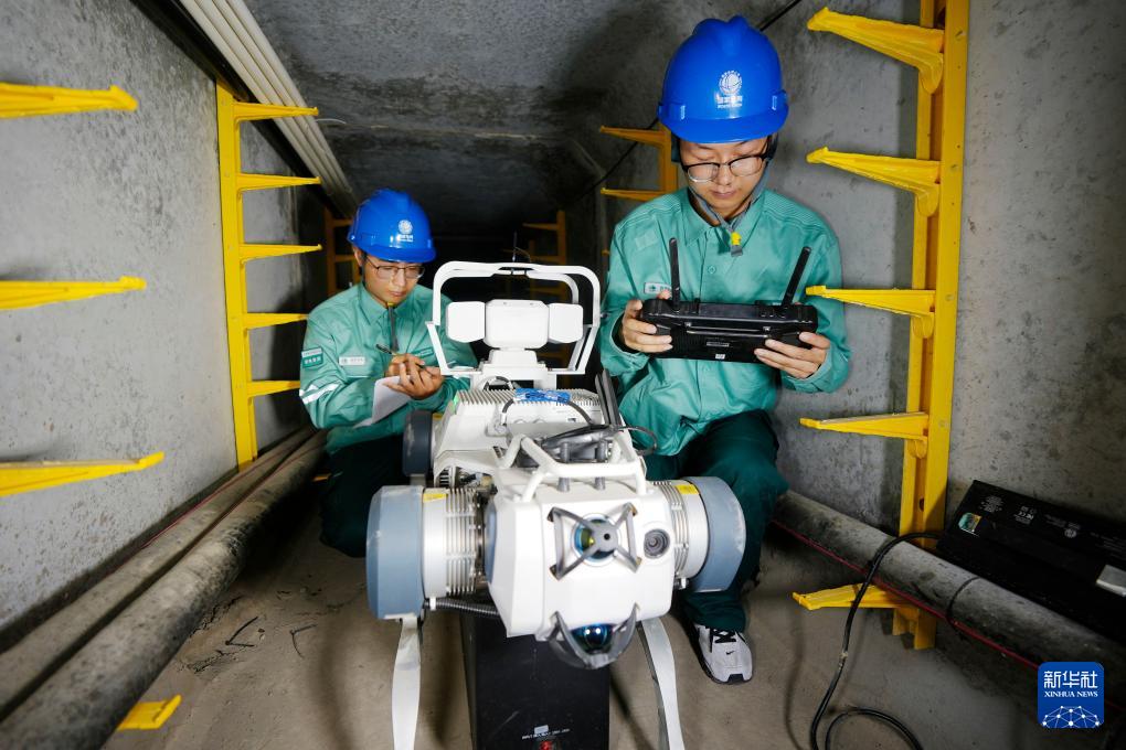 9月10日,国网银川供电公司闽宁供电所工作人员在电缆通道内对机器狗进行调试。