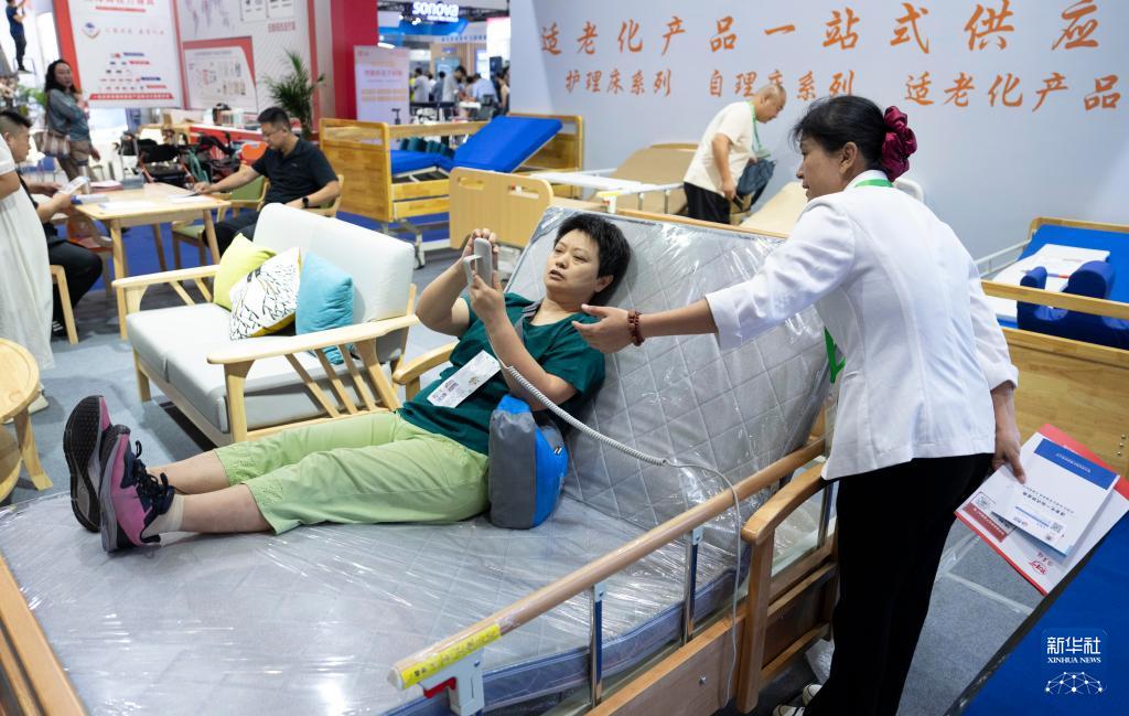 9月12日,参观者在鼎宝医疗展台体验护理床。