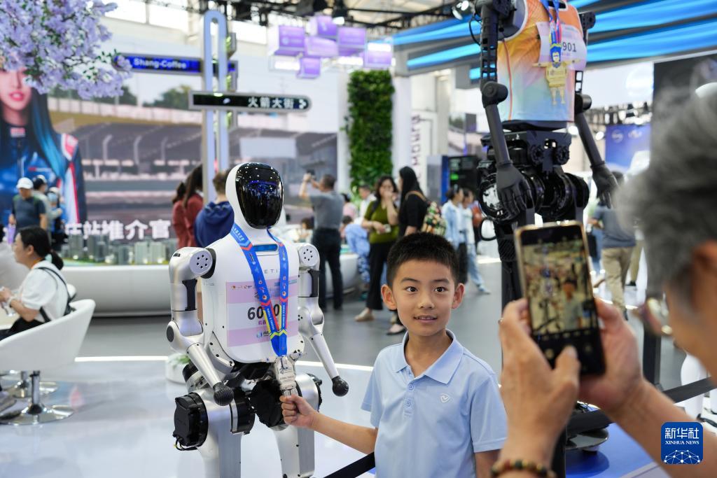 9月13日,在电信、计算机和信息服务专题展区北京方案展展台,小朋友和机器人马拉松比赛获奖机器人合影。