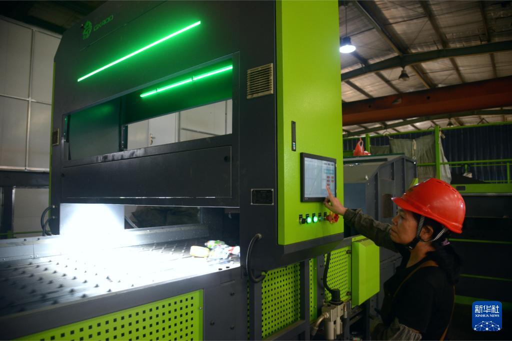 在位于福州马尾区的福州城投再生资源分拣中心,工人操作智能光选机筛选塑料瓶等可回收垃圾(9月13日摄)。