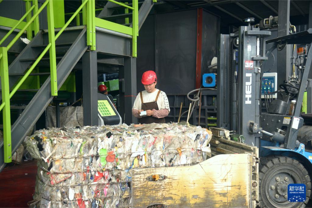 在位于福州马尾区的福州城投再生资源分拣中心,工人为分拣后压缩的可回收垃圾称重(9月13日摄)。