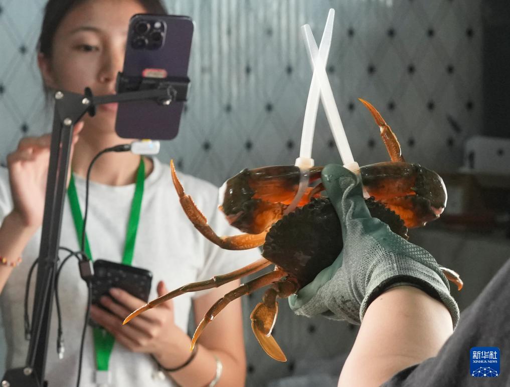 9月16日,在浙江省三门县浦坝港镇浙江百鲜农业发展有限公司,主播在直播推介三门青蟹。