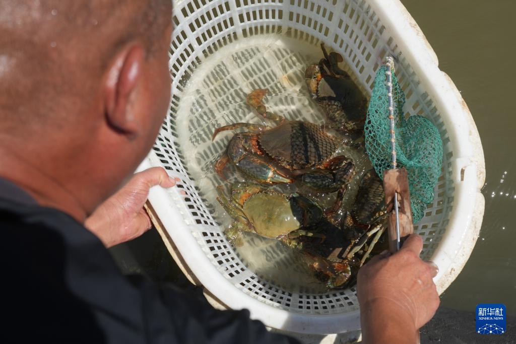 9月16日,在浙江省三门县浦坝港镇一处蟹塘,养殖户在捕捞成熟青蟹。
