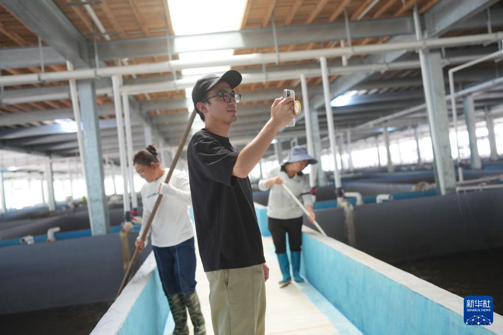 9月16日,在浙江省三门县健跳镇三门东航水产育苗科技有限公司,工作人员利用手机APP实时监控净养池的水质状况。