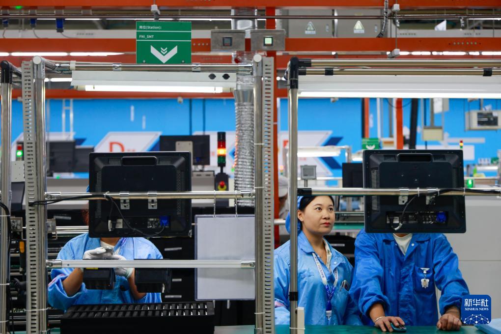 9月15日,工作人员在江苏无锡高新区综合保税区捷普电子(无锡)有限公司的生产车间里进行产品组装及外观检测。