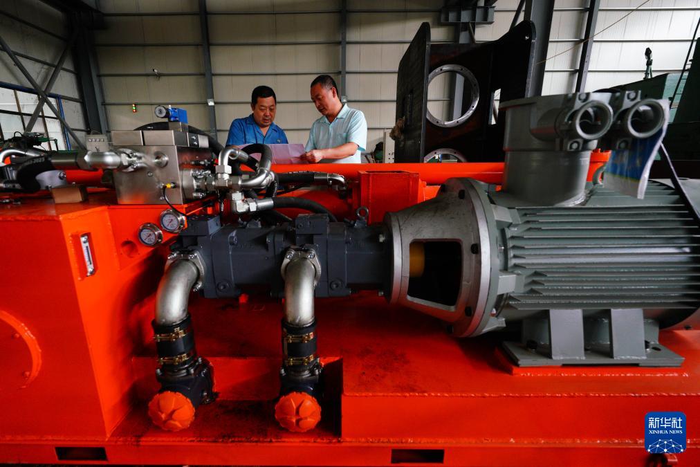 6月20日,河北省邢台市柏乡县一家工矿机械制造企业的员工在调试液压注浆泵。
