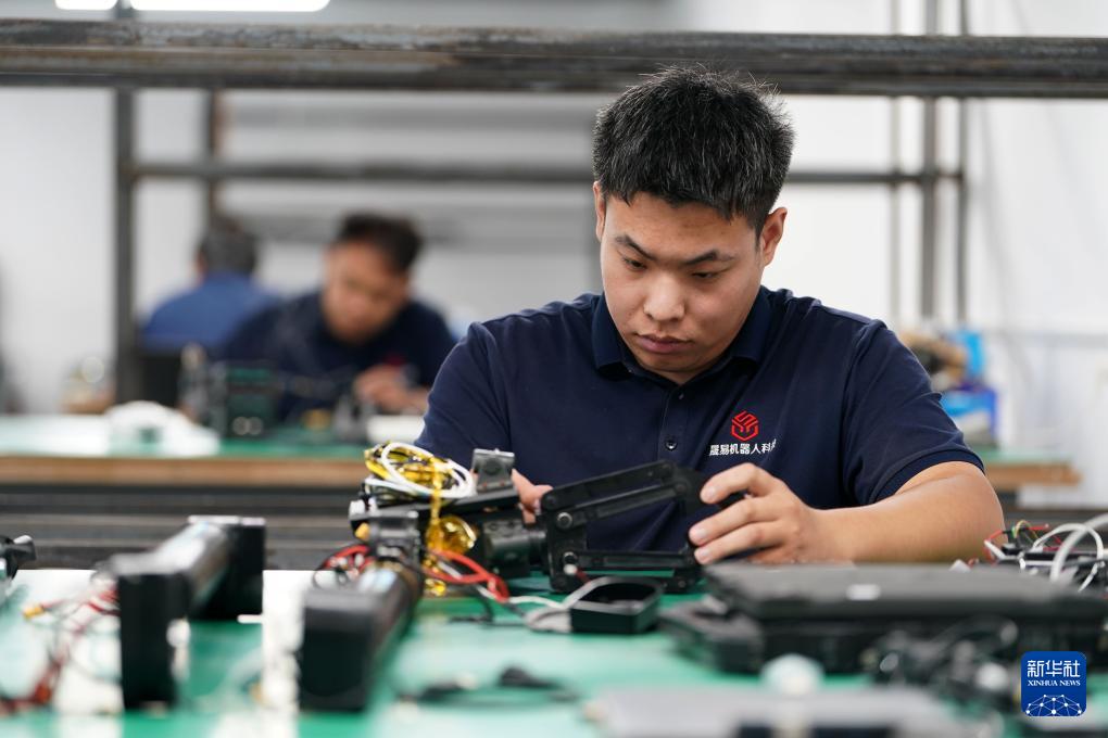 9月20日,河北省邢台市柏乡县一家机器人科技公司的员工在组装产品零部件。