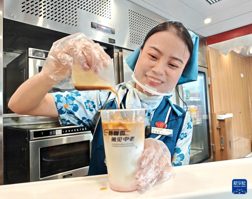 9月20日,工作人员在中老铁路列车上制作玫瑰特调咖啡。