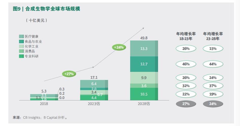 据上海合成生物学创新中心和波士顿咨询公司共同发布的《中国合成生物产业白皮书2024》显示,全球合成生物学市场规模从2018年的53亿美元增长到2023年的超过170亿美元,平均年增长率达27%,预计未来将持续增长,并在2028年达到近500亿美元。