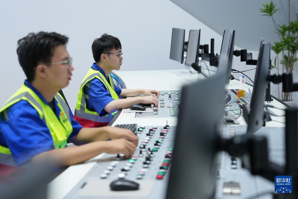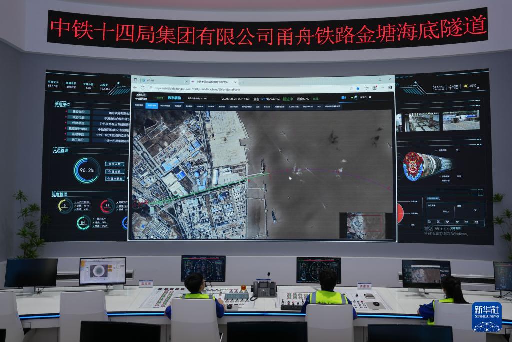 9月22日,中铁十四局技术人员在甬舟铁路金塘海底隧道“甬舟号”盾构机操作室关注设备运行情况。