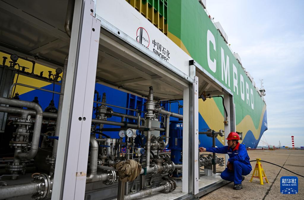 9月22日,在天津港环球滚装码头,工作人员准备进行甲醇加注作业。