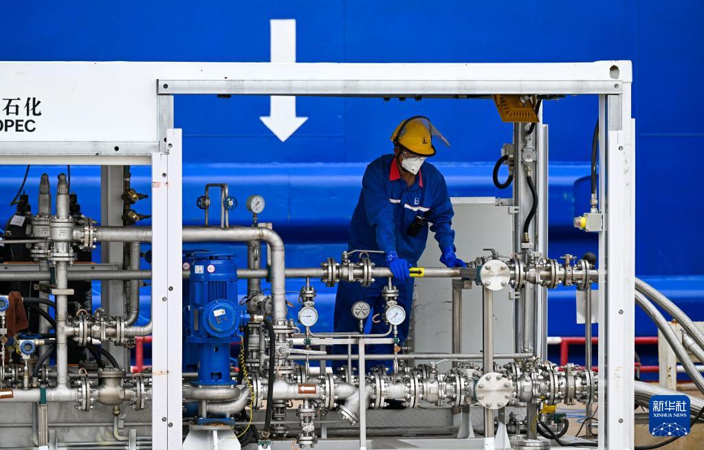 9月22日,在天津港环球滚装码头,工作人员在加注前检查设备。