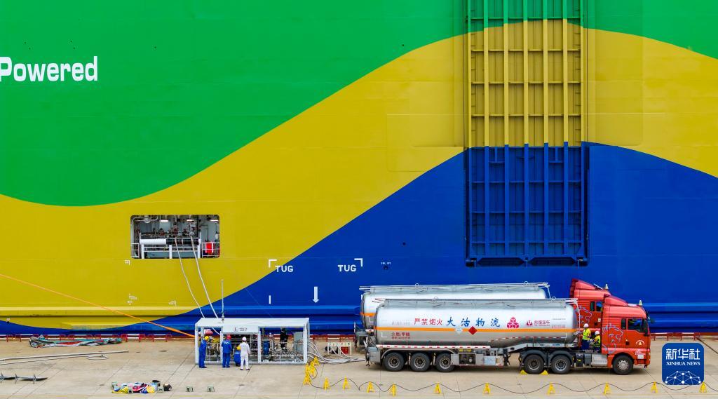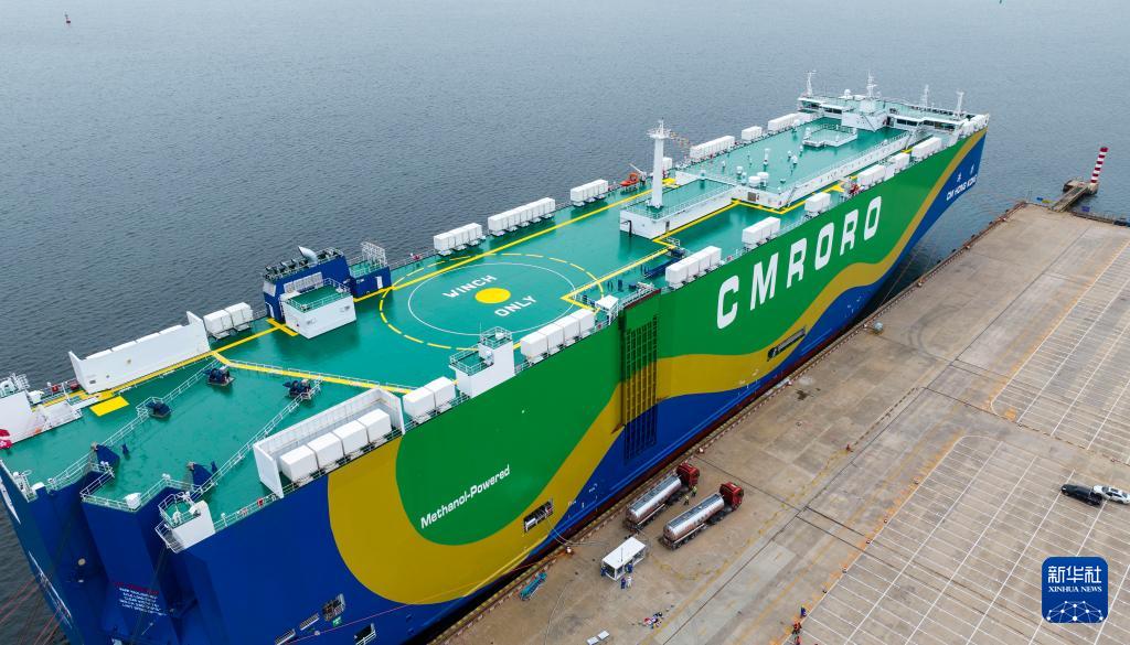 据了解,“港荣”轮是全球首艘采用甲醇双燃料动力系统的大型汽车滚装船。本次加注所用甲醇产自内蒙古,以废旧轮胎和生物质为原料,本次作业可减排二氧化碳460吨。