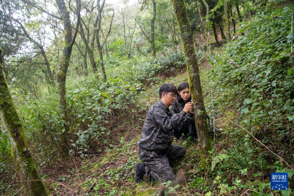 9月22日,在银杉群落监测样地,工作人员李新(右)、王泳鳗在查看001号银杉的健康状况。