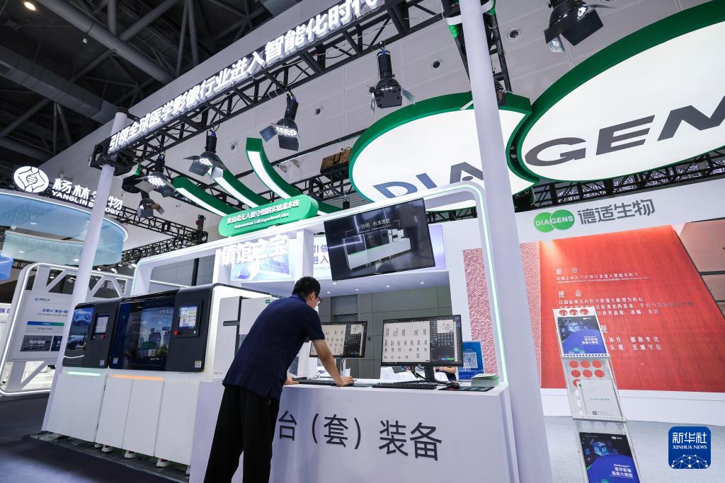 这是9月25日在第四届全球数字贸易博览会数字医疗展区拍摄的德适生物自主研发的“全自动无人值守细胞实验流水线”。