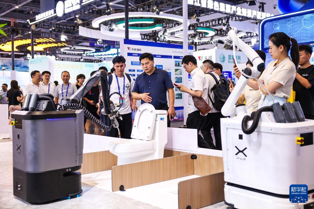 9月25日,观众在第四届全球数字贸易博览会人工智能展区观看一款自清洁机器人工作。
