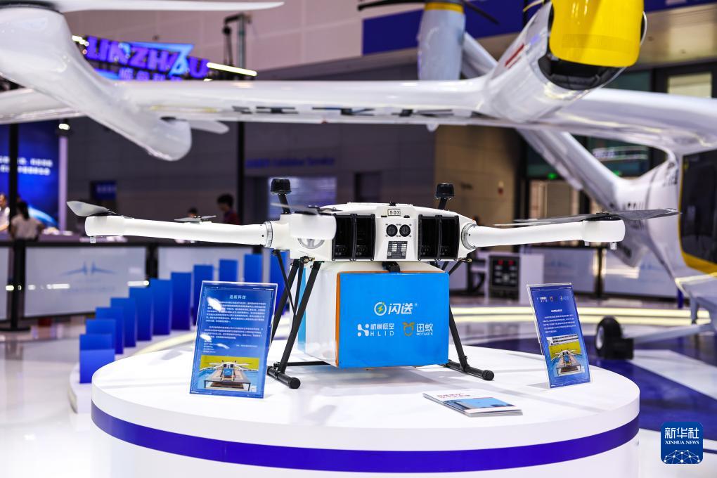 这是9月25日在第四届全球数字贸易博览会数智出行展区拍摄的快递无人机。