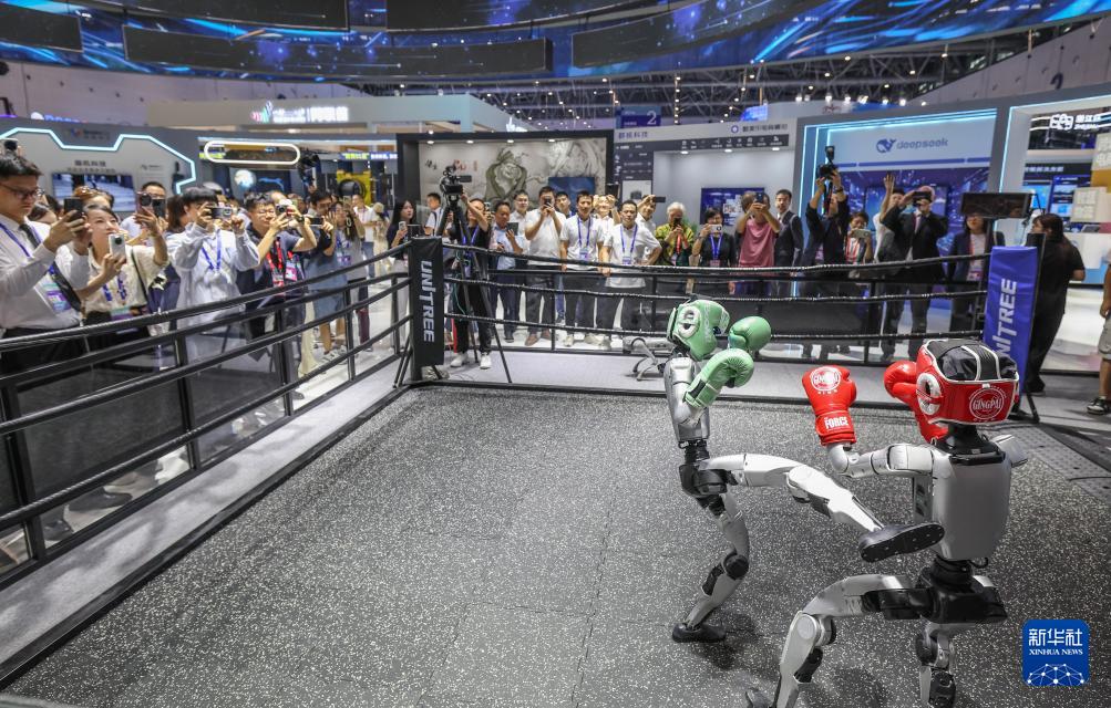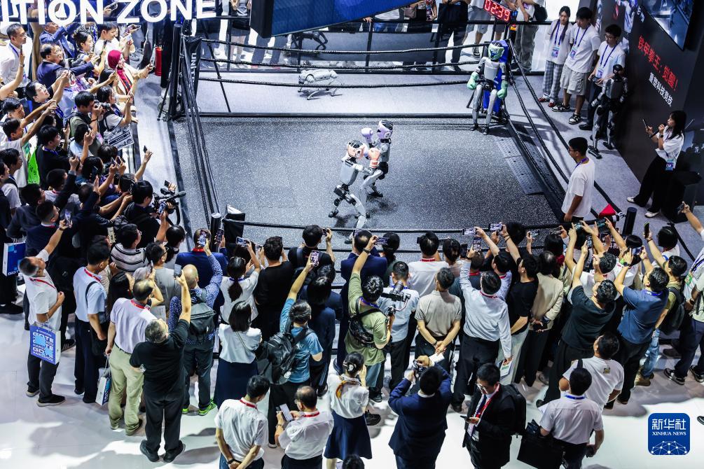 9月25日,在第四届全球数字贸易博览会数智未来主题展区的杭州六小龙专区,观众观看宇树科技的人形机器人进行格斗擂台赛。