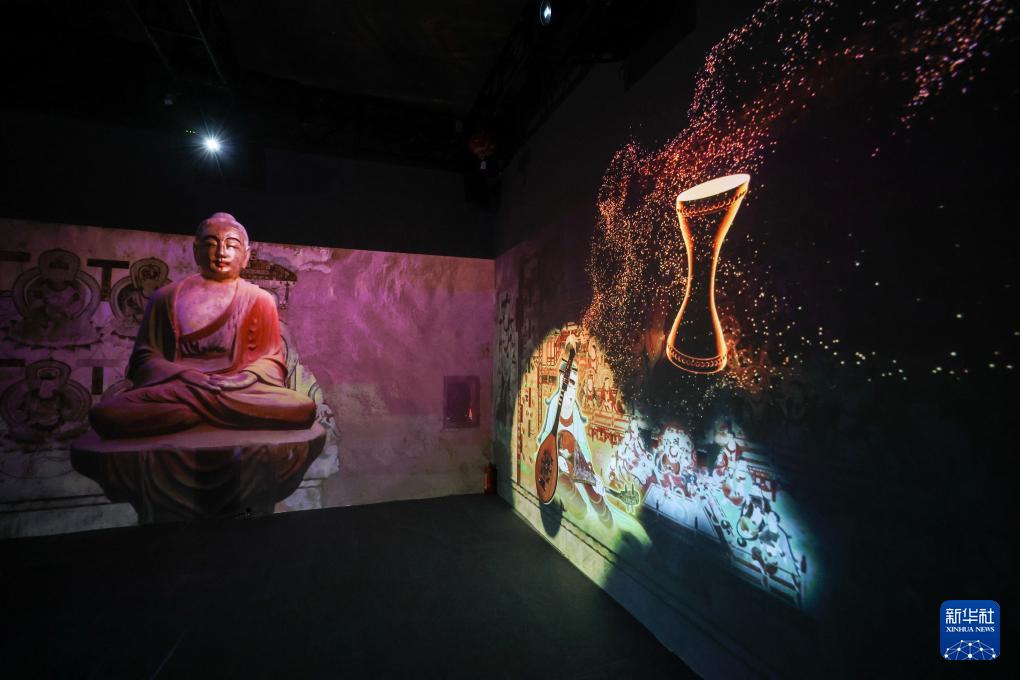 这是9月25日拍摄的第四届全球数字贸易博览会数字文娱展区内的洞窟沉浸式展厅,该展厅是浙江音乐学院与敦煌文旅集团利用AI技术联合打造的敦煌石窟互动音乐特展。