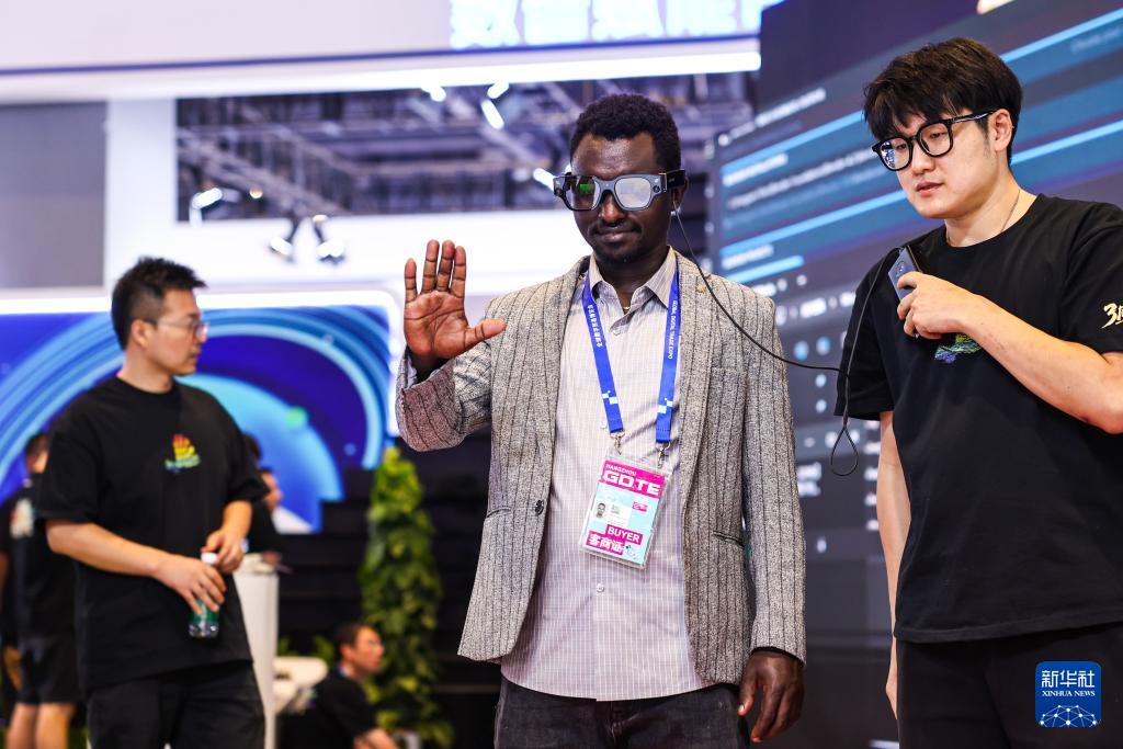 9月25日,外籍客商(右二)在第四届全球数字贸易博览会人工智能展区体验智能眼镜设备。