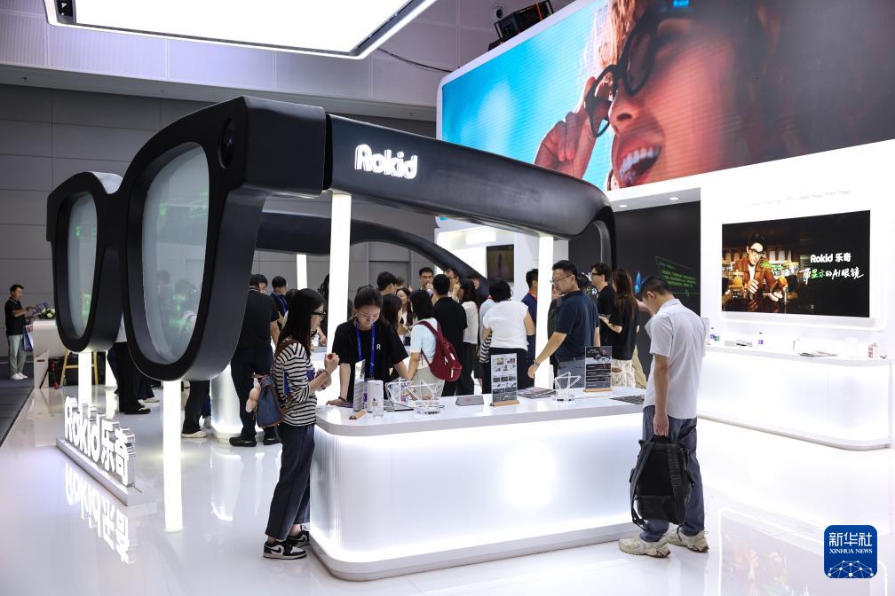 9月25日,观众在第四届全球数字贸易博览会人工智能展区参观智能眼镜设备。