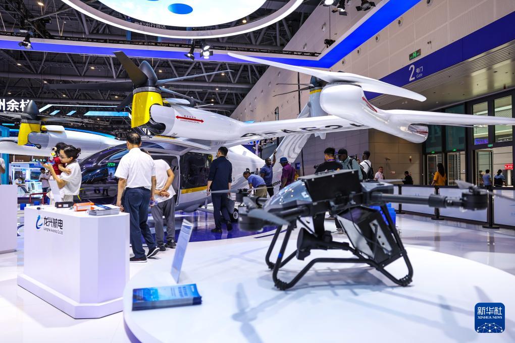 9月25日,观众在第四届全球数字贸易博览会数智出行展区参观无人机。