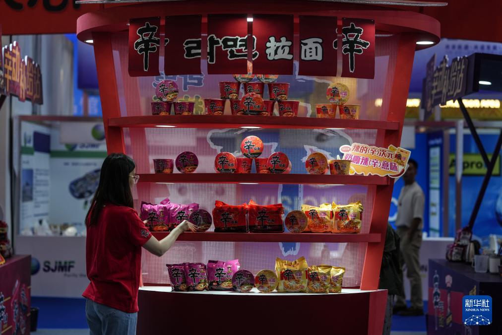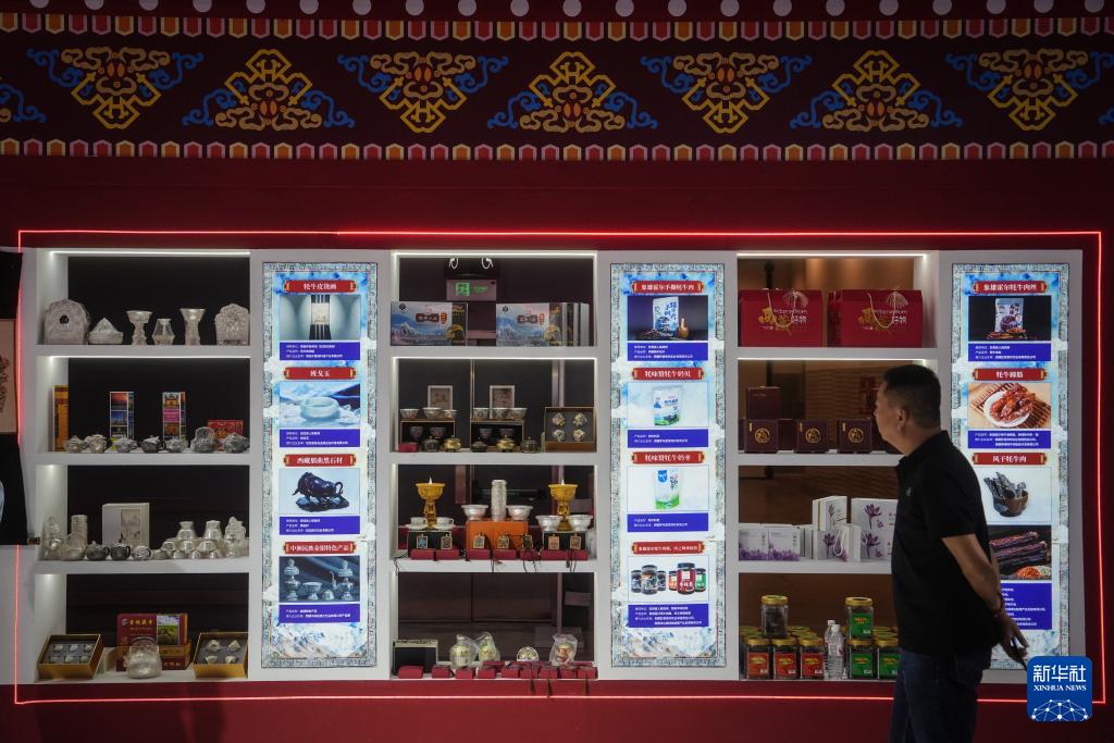 9月25日,工作人员在辽洽会主题展览上整理展出的商品。