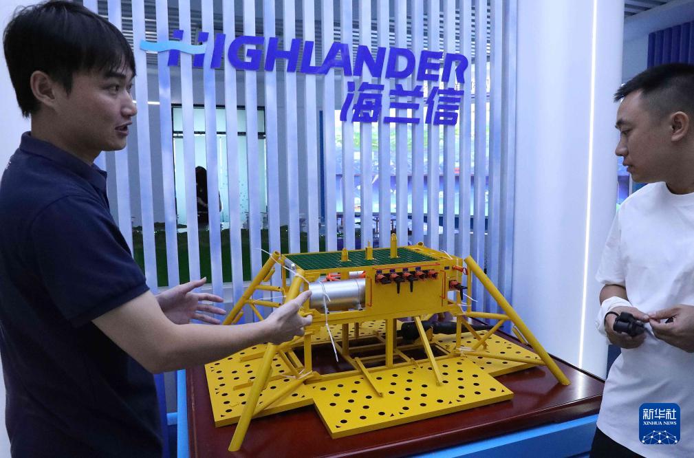 9月25日,工作人员(左)为参观者介绍海南海底数据中心海底观测网主接驳盒模型。