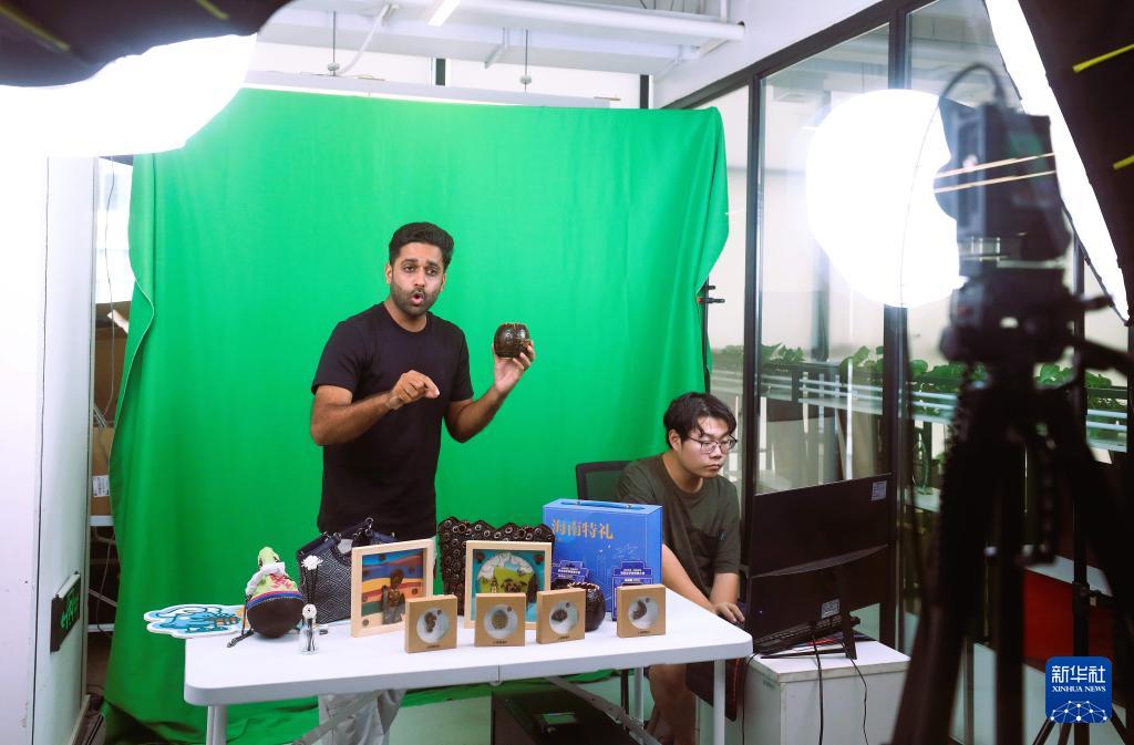 9月22日,在海南省海口市复兴城互联网信息产业园,一名来自巴基斯坦的主播在直播间进行直播带货。