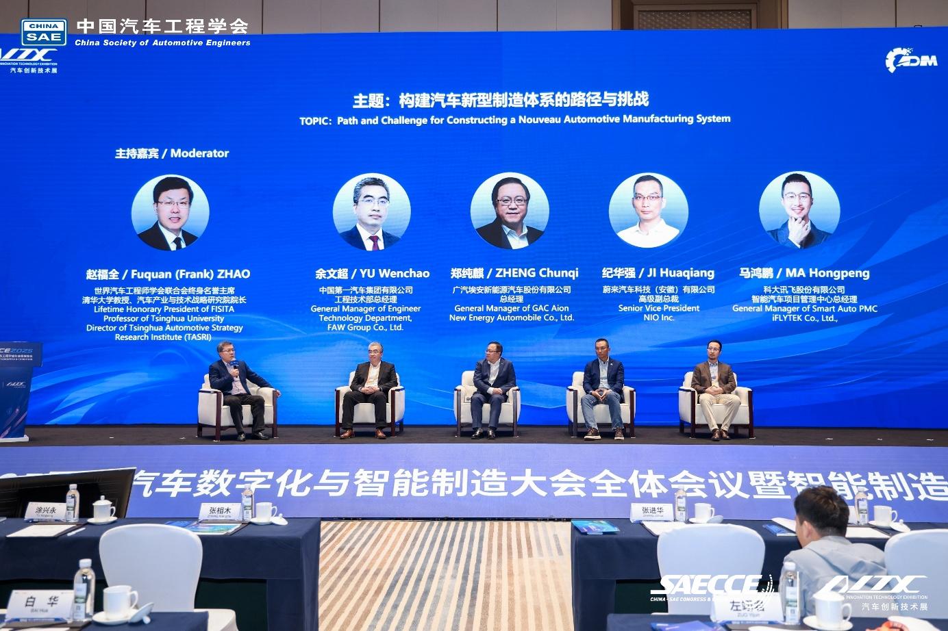 作为数智大会主论坛的品牌栏目,本届大会高层对话以“构建新型制造体系的路径与挑战”为主题。由世界汽车工程师学会联合会终身名誉主席、清华大学教授赵福全任主持嘉宾,中国第一汽车集团有限公司工程技术部总经理余文超、广汽埃安新能源汽车股份有限公司总经理郑纯麒、蔚来汽车科技(安徽)有限公司高级副总裁纪华强、科大讯飞股份有限公司智能汽车项目管理中心总经理马鸿鹏参与对话交流。对话活动围绕企业开展多主体协同创新的实践与挑战、AI+创新场景在汽车智能制造全环节的实践分享与落地挑战、汽车智能制造行业标准体系的需求与瓶颈、中国汽车智能制造面向中长期发展愿景呈现了一场精彩纷呈的思辨盛宴。