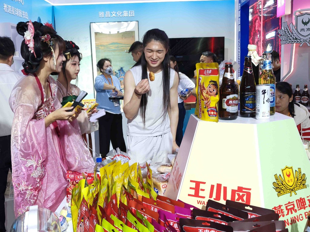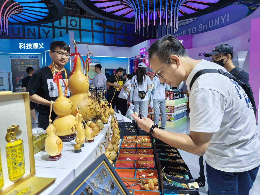 在本次服贸会上,顺义区聚焦文化空间、休闲场所、自然资源、交通资源等内容,展现顺义高品质生活圈。在这里,游客还可以沉浸式品尝顺义特色美食,如牵手咖啡、燕京啤酒、王小卤凤爪、桃李面包等。此外,非物质文化遗产“老北京火绘葫芦”传承人现场通过国画技法在葫芦上烫画,吸引市民体验中华优秀传统文化的独特魅力。