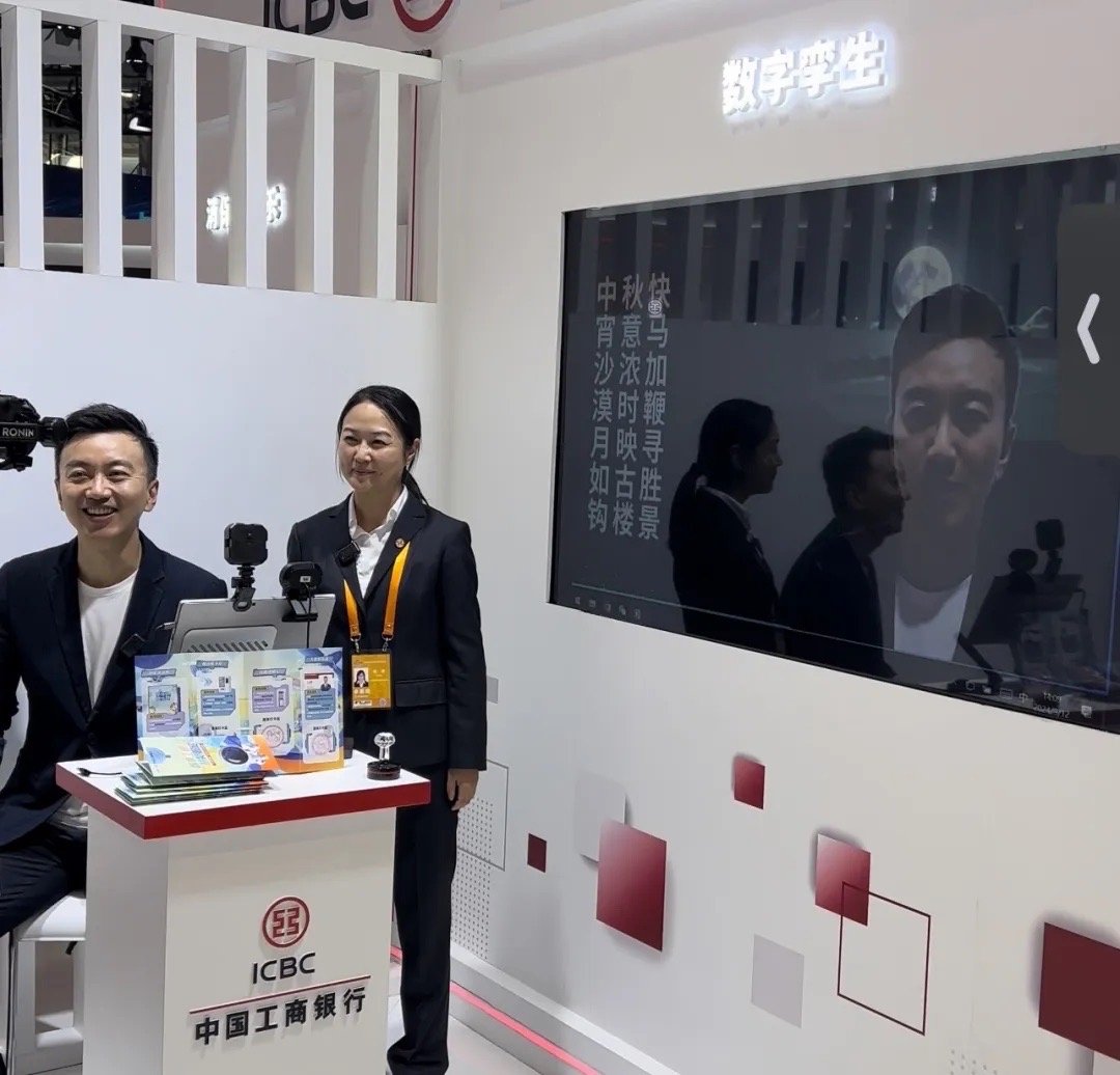 在明芒科技的支持下,工商银行展台还设立了数字孪生体验区,吸引了大批观众驻足,其中也包括北京台财经频道主持人张伟老师。现场观众只需站在互动屏幕前,朗读屏幕上显示的文字,系统便能快速采集形象与声音数据,实时生成观众的“数字分身”。这一技术展现了明芒科技的强大AI处理能力,从形象生成到声音匹配,整个过程仅需几分钟。参观者不仅能立即看到自己的数字形象,还能选择多种视频模板进行个性化定制,生成属于自己的数字人视频。