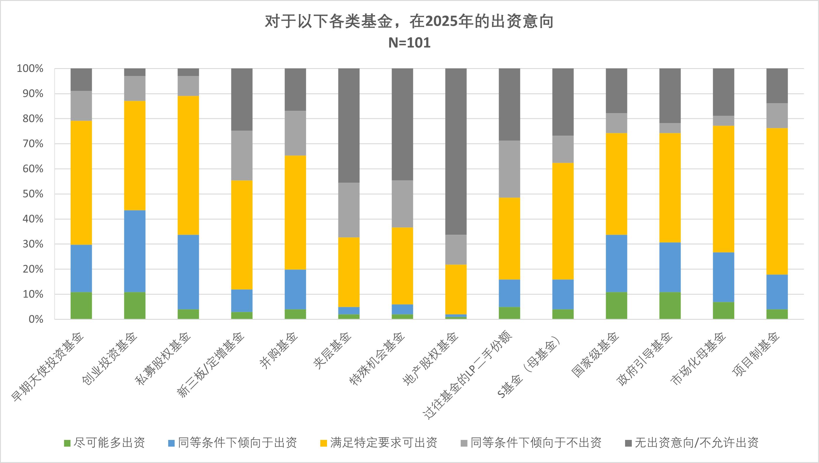本次调研问卷题目共101题,涵盖了政府引导基金、央企/国企、险资、家族办公室等101家机构LP。以下为调研结果发现: