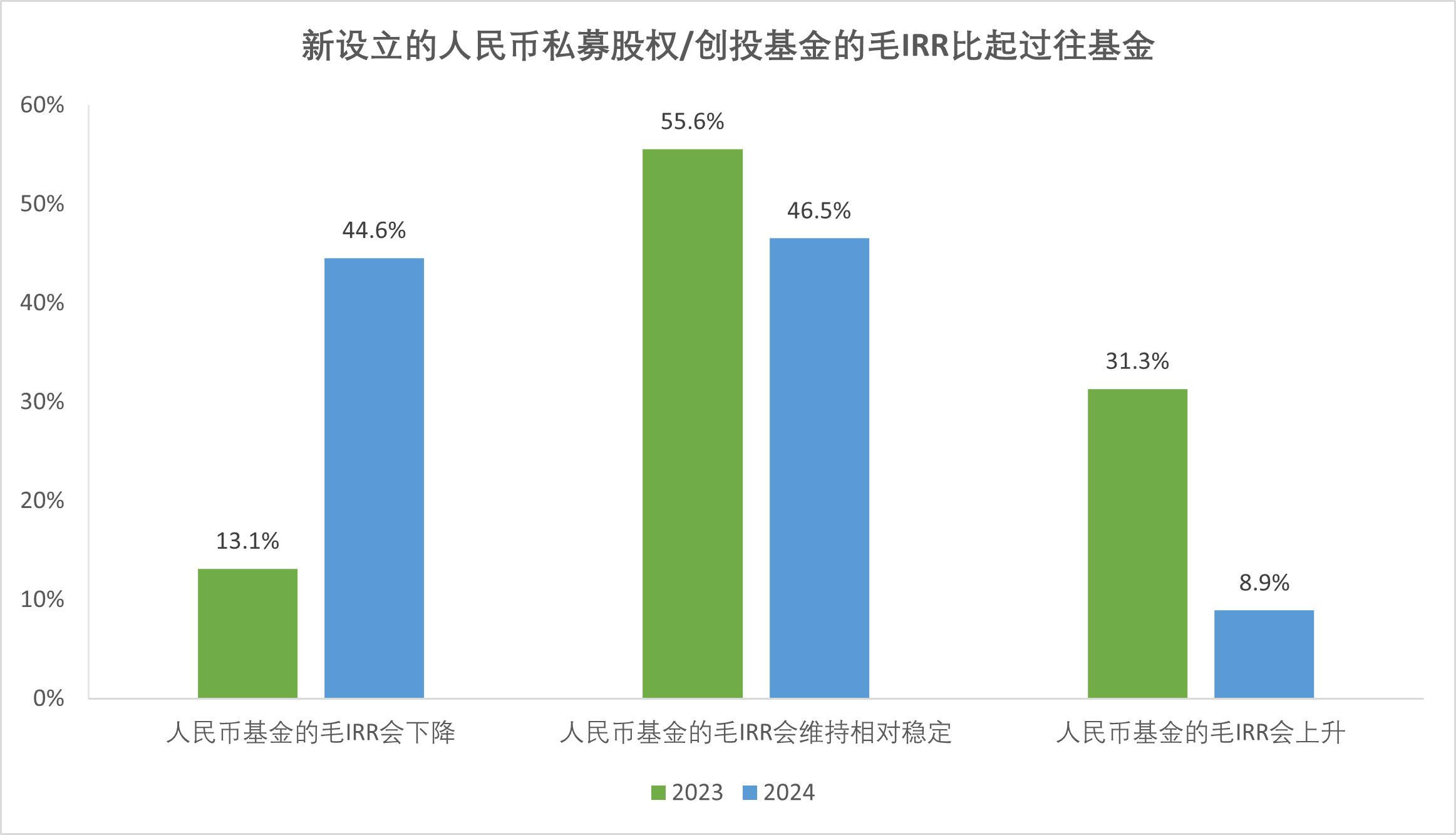 调研结果显示,IRR主要集中在5%-20%区间(63.4%),仍有16.8%的机构IRR低于5%,人民币基金业绩分化明显;44.6%预测新基金IRR将下降。