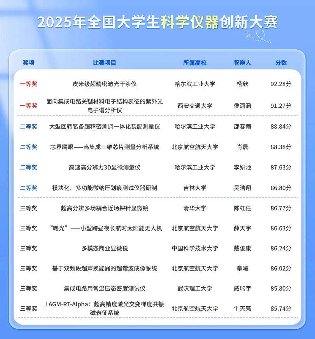 8月13日,2025年全国大学生科学仪器创新大赛决赛在京举办。经过激烈角逐,“皮米级超精密激光干涉仪”“面向集成电路关键材料电子结构表征的紫外光电子谱分析仪”“芯界鹰眼——高集成三维芯片测量分析系统”等12个项目脱颖而出,获得本届大赛一、二、三等奖。