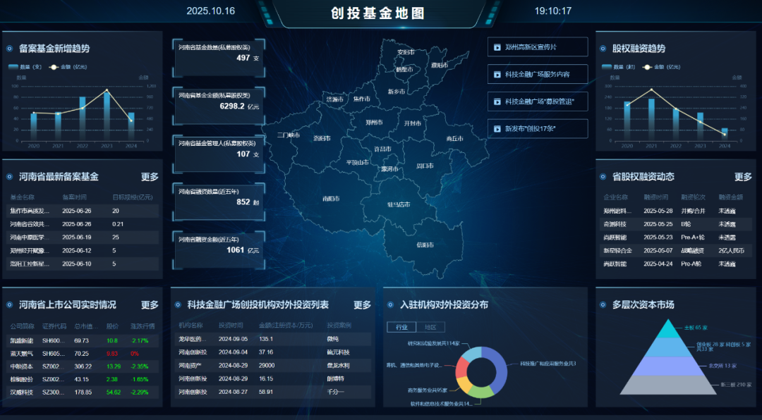 可视化呈现全国主流创投基金的分布情况、投资偏好与阶段标签,支持按地域、赛道、投资阶段进行筛选,帮助科技企业精准定位“对的资本”,并展示近五年河南省新增备案基金数量及规模、股权融资趋势以及舆情监控。