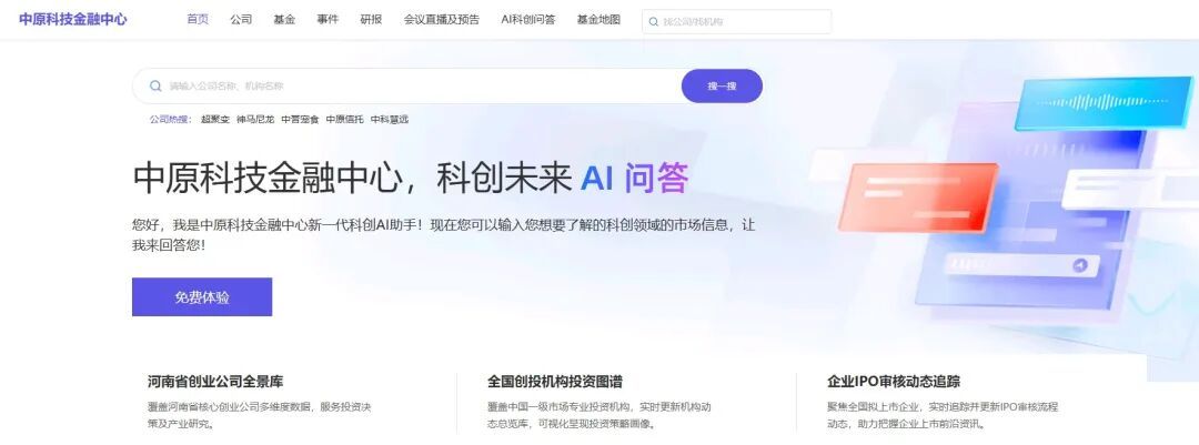 作为垂直领域的大模型平台,“中原科技金融中心”聚焦科技企业成长全周期与金融服务全流程。该平台集成企业库、创投基金资源、行业研报、融资数据、会议服务等多维功能模块,通过深度学习政策文件、企业数据与创投基金信息,构建起懂科技、懂金融、懂政策的“超级顾问”能力,致力于为河南省乃至全国的科创企业提供从0到IPO全生命周期一站式服务。