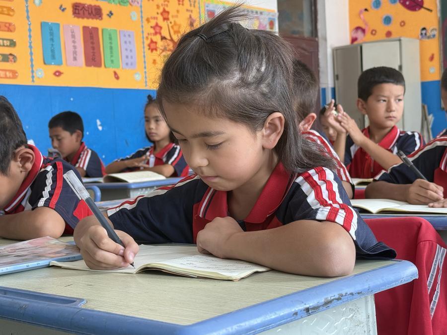 9月17日,鄯善县达朗坎乡中心学校三年级四班学生乃则热与同学们上数学课。(受访者供图)