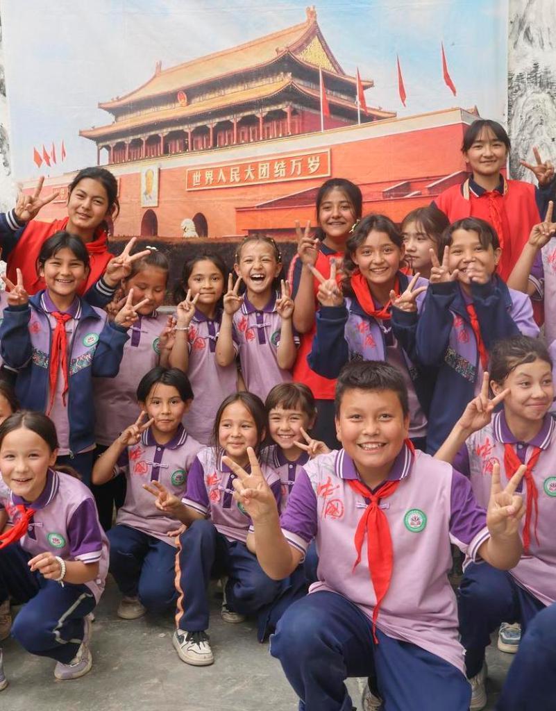 一次拍合影,70多岁的老人摸着背景布上的红墙,念叨着:“你看现在,我们住的房是北京援疆修的,孩子校服上印着‘北京援疆’,连天安门都‘来’沙漠看我们了!”