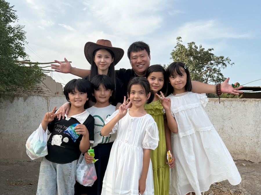 乃则热·艾尼瓦尔(前排中间)和朋友在自家院子里与湖南游客合影。(受访者供图)
