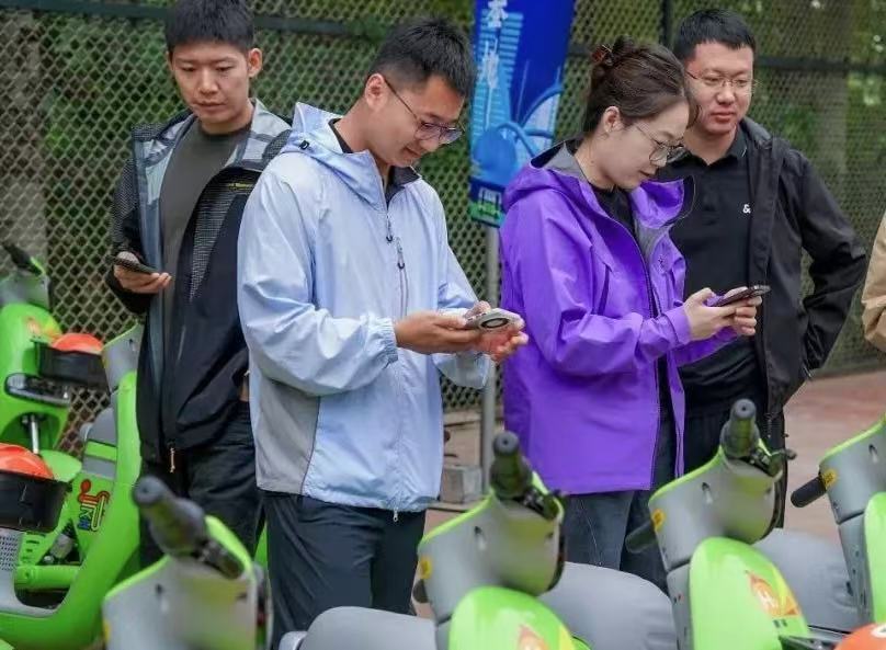 在内蒙古自治区鄂尔多斯市康巴什街头,市民扫码体验“氢个蛋”共享单车。(受访者供图)