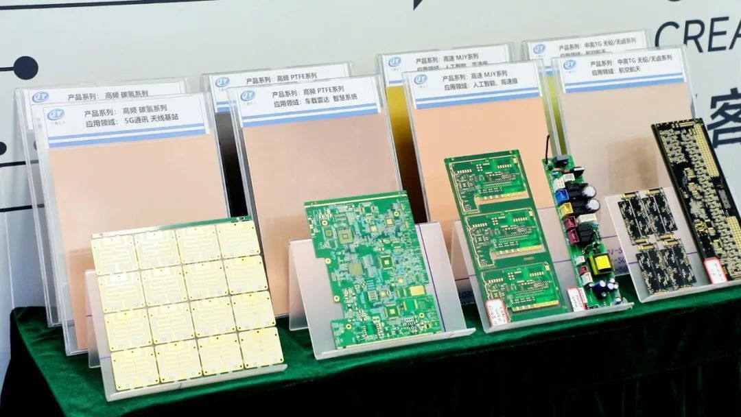 久耀电子科技(徐州)有限公司运营副总监彭海雷说:“这里展示的是我们覆铜板的几类产品形态。其一,是通信类碳氢产品,主要用于通信信号传输;其二,是应用于毫米波车载雷达领域的产品;其三,是在当前热门的AI算力算法领域应用广泛的产品类别;此外,还有适配航空航天等领域的产品,这类场景对板材的性能、稳定性及质量要求均较高。旁边展示的是我们下游客户的产品加工形态。我们会将全铜板形态的产品交付给客户,客户需自行蚀刻线路,去除多余部分以得到所需线路;后续,客户会进行绿油涂覆、插件安装等工序,最终将产品应用于家用电器、机房高速设备等场景,服务于实际生活需求。”
