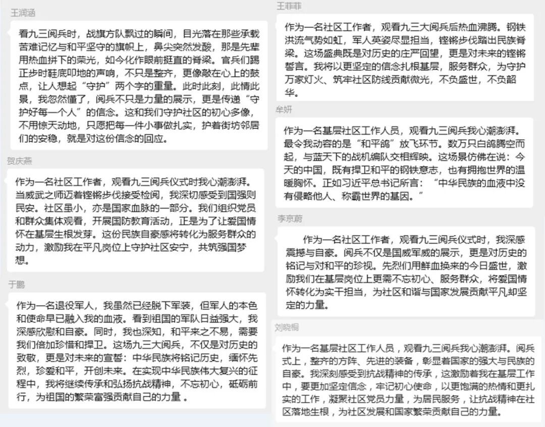 观看结束,社区党组织还特别设置了“初心分享”环节。党员和群众结合自身经历,畅谈对历史的理解、对当下的感悟。“作为一名基层社区工作人员,我将继续思为民服务之责、添干事创业之劲。今后,海越社区将把今天激发的澎湃热情,转化为扎根社区、服务居民的实际行动,以更加饱满的热情、更加务实的作风,投身到社区工作中,为筑牢党的执政根基、构建和谐美好社区、实现中华民族伟大复兴的中国梦贡献坚定力量!”社区党总支书记的发言引发共鸣。大家纷纷表示,要把阅兵式中感受到的爱国热情和民族精神,转化为服务群众的实际行动,在化解邻里矛盾、推进基层治理、开展志愿服务中践行使命。