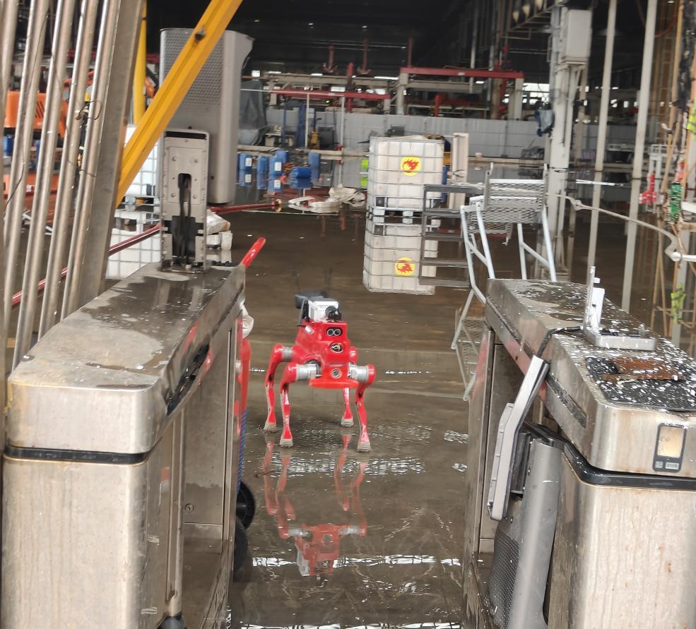 在大跨度大空间厂房灭火救援实战演练现场,火灾初期侦察阶段,多模态消防机器狗可以迅速部署到火灾现场,利用其携带的各种传感器进行全方位的侦察,将现场的图像、视频实时回传至指挥中心。